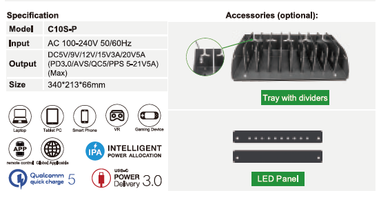 AVL-C10S-P 1000W 10-Port USB-C Charging Dock with Tray