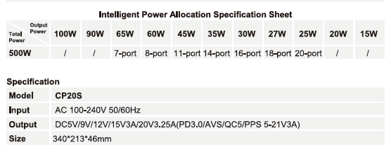 • 500W USB-C charging station with 20 ports for high-capacity use